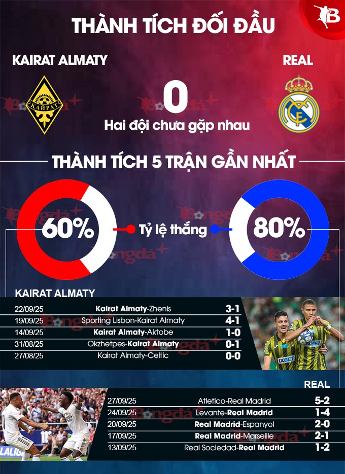 - Lẻ bàn thắng: 8/11 trận đấu gần đây của Kairat Almaty đều kết thúc với tổng số bàn thắng là số lẻ. Tình trạng tương tự xảy ra ở 7/8 trận đấu chính thức vừa qua của Real Madrid.