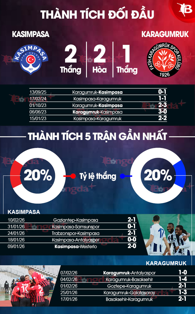 Chưa hết, Kasimpasa bất bại trước Karagumruk ở 4 trận gần nhất khi thắng 2, hòa 2. Riêng 7 trận gần nhất khi Kasimpasa tiếp Karagumruk trên sân nhà, họ thắng 4, hòa 2 và thua 1. Khả năng cao 3 điểm sẽ về tay Kasimpasa.