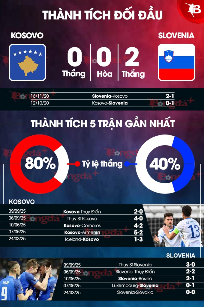 - Bùng nổ bàn thắng: 4/5 trận gần đây của Kosovo đều kết thúc với ít nhất 4 bàn thắng được ghi. Với Slovenia, 3 trận ra quân vừa qua của các cầu thủ khách cùng trận đối đầu gần nhất đều có 3 bàn thắng mỗi trận.