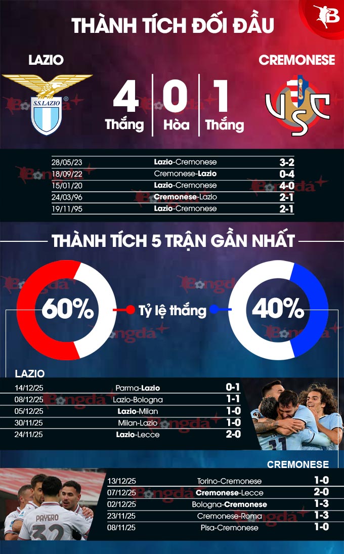 Lazio có sự ủng hộ lớn lao từ lịch sử khi toàn thắng cả 7 lần gần nhất tiếp đón Cremonese trên sân nhà tại Serie A. Dù không có lực lượng mạnh, lại thiếu vài trụ cột quan trọng như tiền đạo Gustav Isaksen và cầu thủ chạy biên Mattia Zaccagni, Đại bàng Lazio đủ sức đánh bại Cremonese.