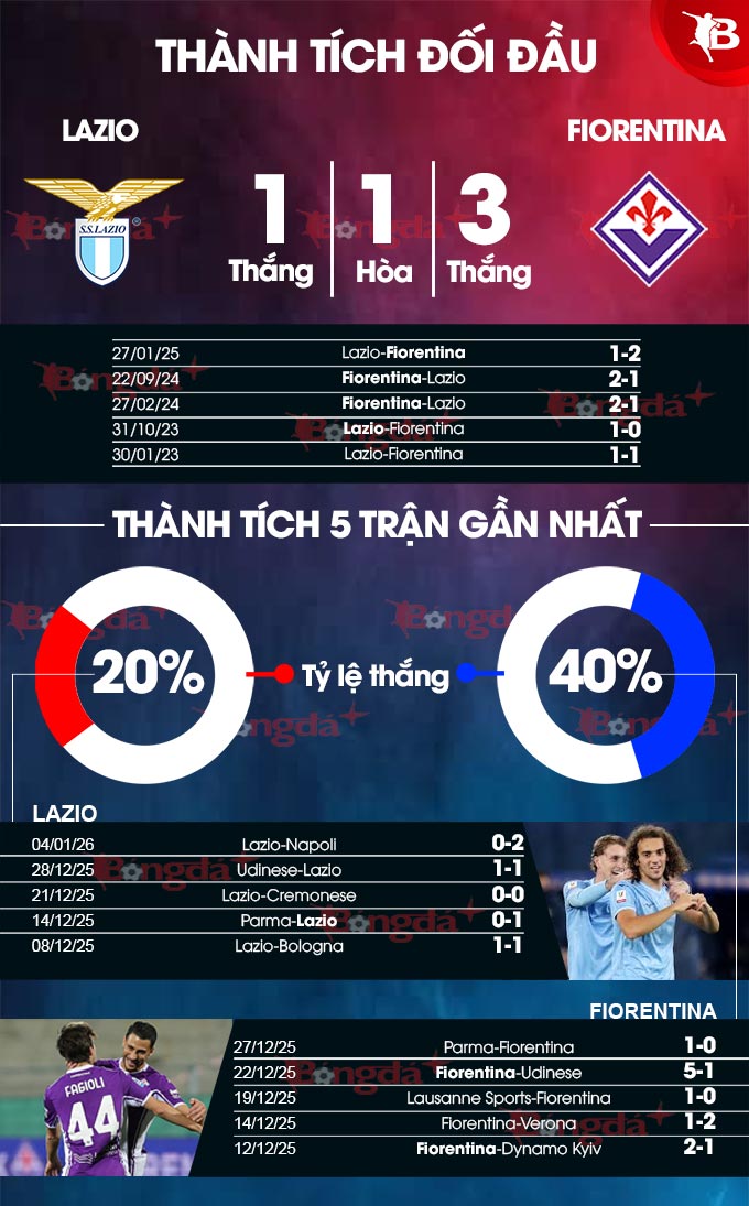- Hai đội không cùng ghi bàn: 3/4 trận gần nhất của Lazio đều có đội "tịt ngòi". 3/4 trận gần đây của Fiorentina cũng có đội thành công trong việc giữ sạch lưới.