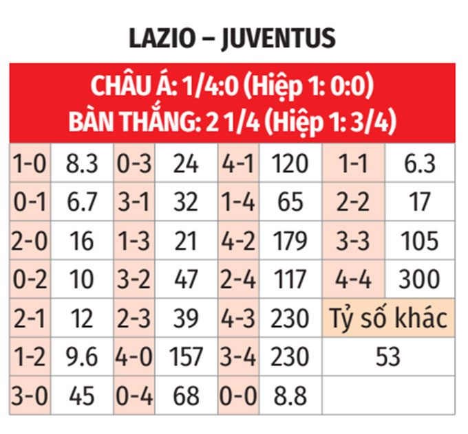 - Tối đa 2 bàn: 4/5 trận gần đây của Juventus chỉ có tối đa 2 bàn. 4/5 trận gần nhất giữa đội bóng này và Lazio số lần lưới rung cũng không lên được tới 3.