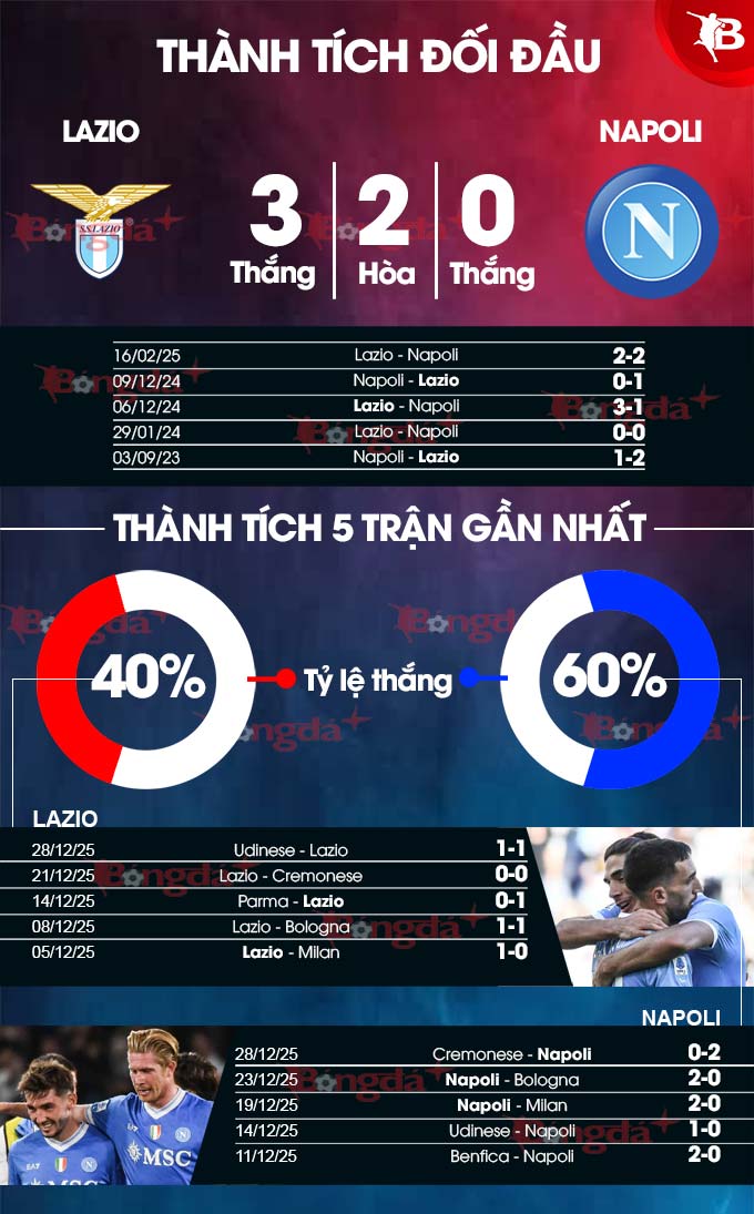 - 2 đến 3 bàn: 6/7 trận chính thức gần đây của Napoli có từ 2 tới 3 bàn, điều tương tự cũng xảy ra ở 3/4 trận sân nhà vừa qua của Lazio tại Serie A. 5 lần đối đầu gần nhất khi Napoli không phải đội dưới cơ, 4 trận khép lại với tổng bàn thắng rơi vào đoạn từ 2 đến 3.