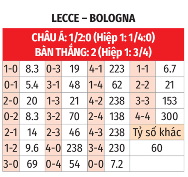 - Tối đa 2 bàn: 3/4 trận gần đây giữa Lecce và Bologna đều chỉ có tối đa 2 bàn. 4/5 trận vừa qua của Bologna cũng diễn ra theo kịch bản tương tự.
