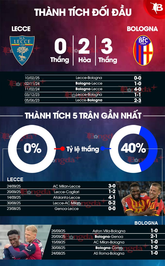 Với phong độ kém cỏi như vậy, rất khó để tin rằng Lecce có thể cầm cự được với Bologna, nhất là khi họ không được lịch sử ủng hộ. Nên biết, trong quá khứ Lecce từng gặp Bologna 32 lần ở Serie A mà chỉ giành được 3 chiến thắng. Riêng ở 9 cuộc đụng độ gần đây giữa 2 bên, Lecce chỉ biết đến hòa và thua trước Bologna, trong đó có 6 thất bại.
