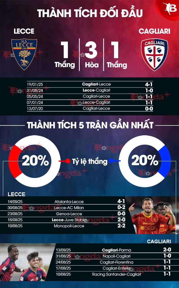 - X bàn thắng: 5/7 trận gần đây của Lecce cùng 8 trận liên tiếp vừa qua của Cagliari đều có tối đa 2 bàn thắng. Chưa kể, 4/5 trận đối đầu gần nhất cũng xuất hiện không quá 2 pha làm bàn.