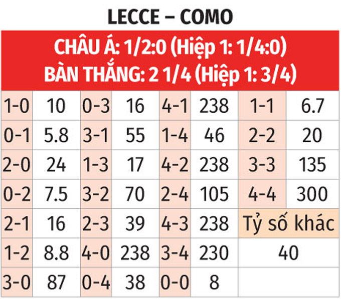 - Hiệp 1 có ít nhất 1 bàn: 4/5 trận so T gần đây giữa Lecce và Como đều có bàn thắng trong 45 phút đầu tiên. Ngoài ra, 3/5 trận vừa xong của Como cũng có tối thiểu 1 bàn trước giờ nghỉ.