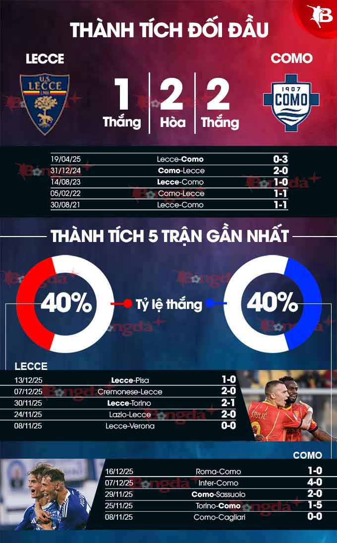 Trong khi đó, Como chỉ thắng 2/7 trận sân khách vừa qua. Tuy vậy, Como nhỉnh hơn ở khoản đồi đầu trực tiếp khi đánh bại Lecce ở 2 trận gần nhất. Dù thế, Lecce vẫn có cách để khiến Como mất điểm.