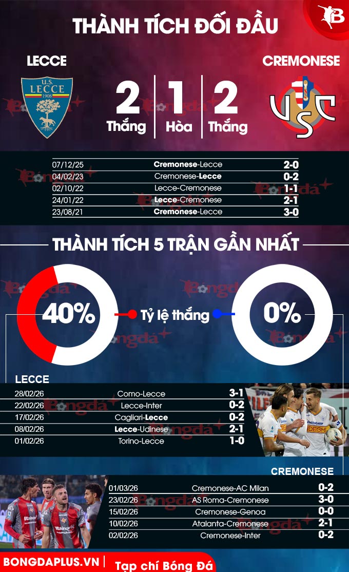 - Chẵn bàn thắng: 3 lần gặp nhau giữa 2 đội gần đây kết thúc chẵn bàn thắng. 3 trận gần đây của Lecce cùng 3/5 trận vừa qua của Cremonesen cũng xảy ra tình trạng tương tự.