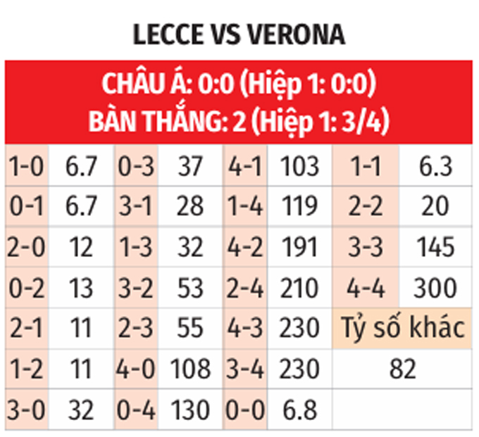 - Ít nhất 1 bàn ở hiệp 1: 3/4 trận chính thức gần nhất giữa Lecce vs Hellas Verona có tối thiểu 1 lần lưới rung hiệp 1. 3/4 trận chính thức vừa xong của Lecce và 3/5 trận mới đây của Hellas Verona có kịch bản tương tự. NHM nên đợi sau 15 phút đầu thì đặt niềm tin vào nhiều bàn hiệp 1.