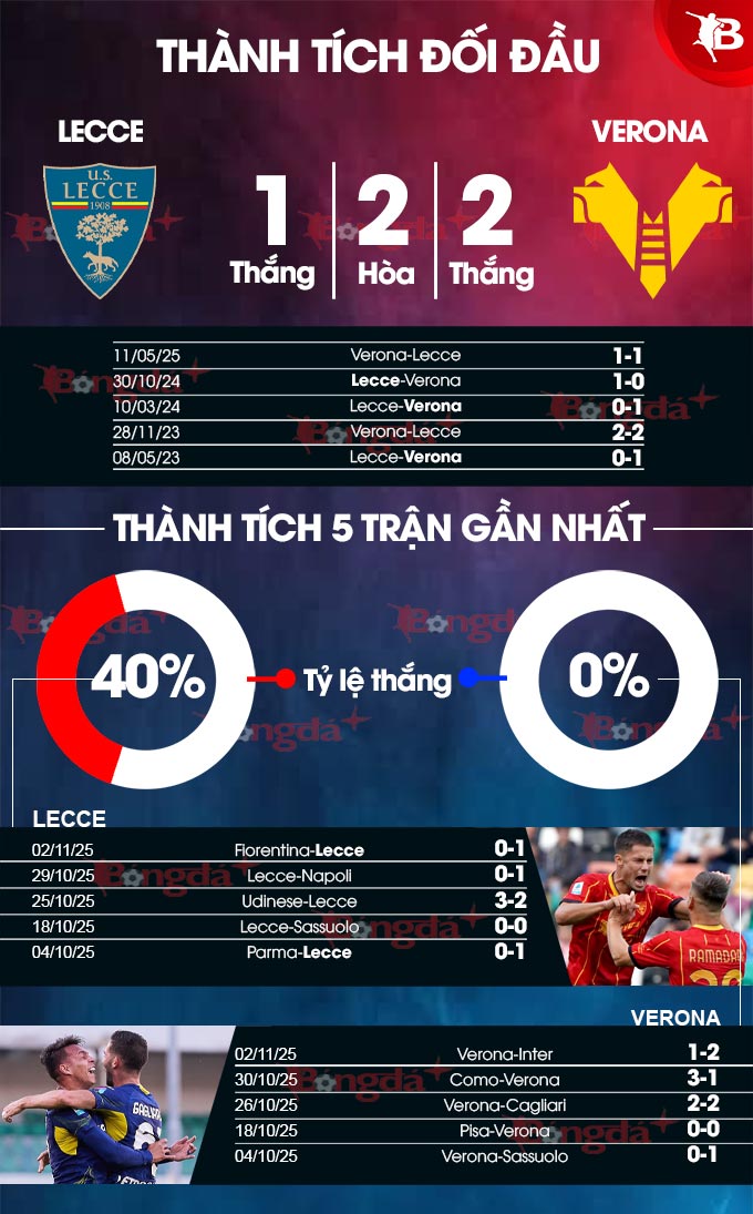 5 trận so T gần đây giữa Lecce vs Hellas Verona có ít bàn thắng. Có cả thảy 9 bàn được ghi ở thời gian này, trung bình 1,8 bàn mỗi trận.
