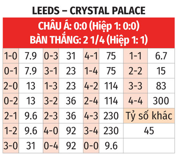 Hơn nữa trong 4 trận gần nhất khi gặp Leeds, Palace thắng 2 và hòa 2. Nhìn vào tình hiện tại, khả năng cao, 3 điểm sẽ về với Crystal Palace.
