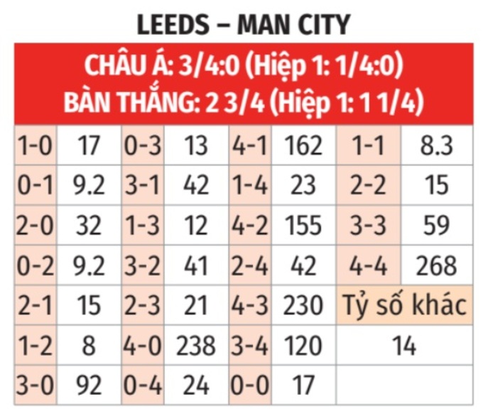 • Tối thiểu 3 bàn thắng: 6 lần gặp giữa 2 đội gần đây đều có ít nhất 3 bàn thắng. 9/11 trận sân nhà gần đây của Leeds và 5/6 trận vừa qua của Man City xảy ra tình trạng tương tự.