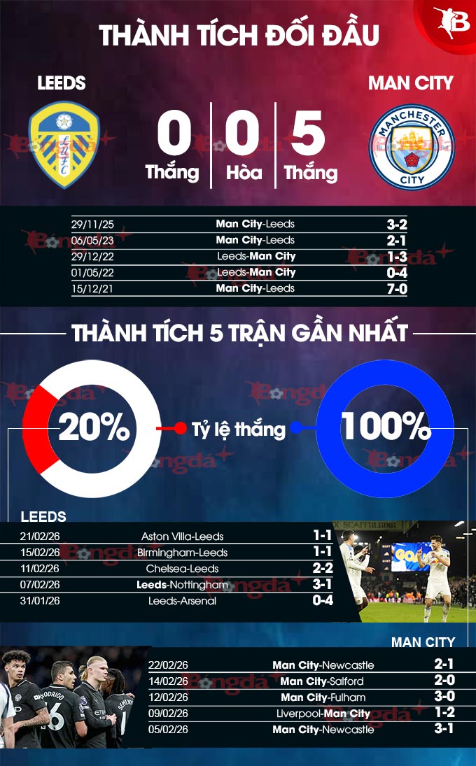 Nhận định bóng đá trận Leeds vs Man City diễn ra vào lúc 00h30 ngày 1/3 ở vòng 28 Ngoại hạng Anh 2025/26. Bongdaplus phân tích thông tin lực lượng, đội hình dự kiến, dữ liệu chuyên sâu, dự đoán tỉ số.