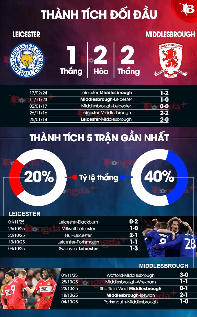- Ít bàn thắng: 6/8 trận gần đây của Leicester cùng 5/7 trận vừa qua của Middlesbrough đều có tối đa 2 bàn thắng được ghi. Ngoài ra, 4/7 trận đối đầu gần nhất cũng xuất hiện tối đa 2 pha làm bàn.