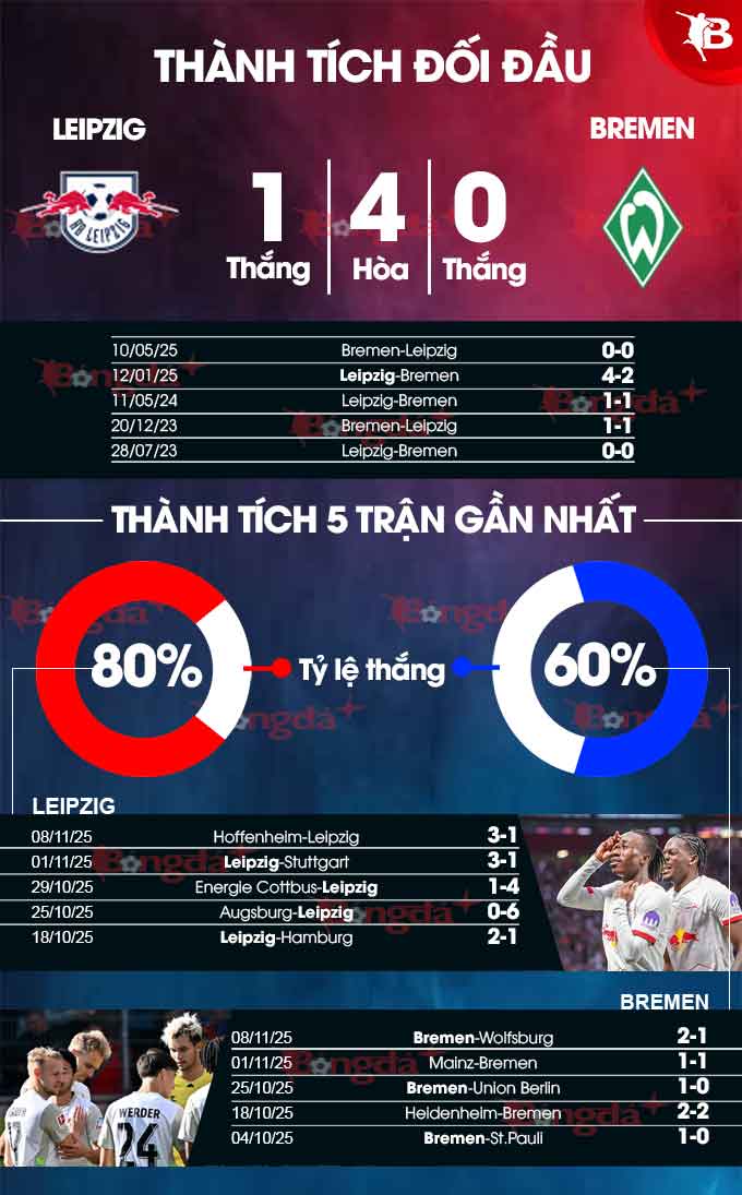 Đáng chú ý, 10 lần gần nhất hành quân tới sân của Leizpig, Bremen thua 8 và hòa 1. Do đó, khả năng cao là Leipzig sẽ giành trọn 3 điểm ở trận này.