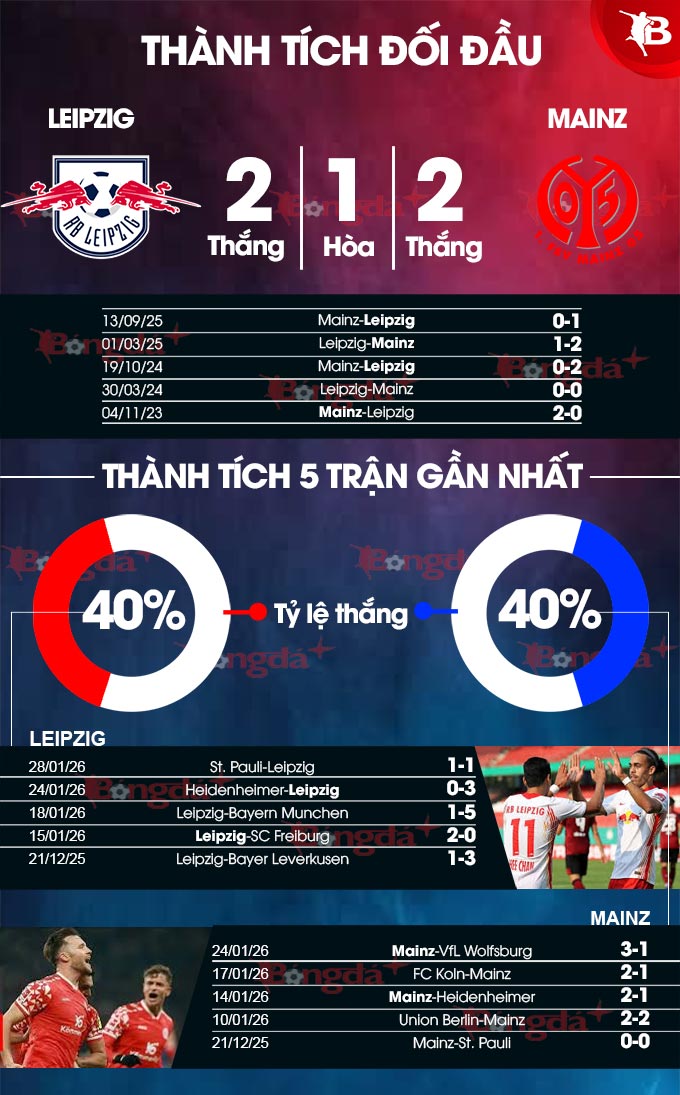 Trong cả 3 lần tiếp đón Mainz gần đây, Leipzig đều không giành được chiến thắng và phải nhận tới 2 thất bại.