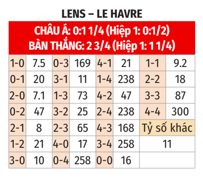 - Lens ghi bàn hiệp 1: Lens ghi bàn trong hiệp 1 ở cả 3 lần gần nhất đụng độ với Le Havre, ở 5/7 lần gần đây đón tiếp Le Havre. Hơn nữa, Lens cũng xuyên thủng lưới đối phương trong hiệp 1 ở 6/9 trận vừa qua, ở 6/8 trận gần đây trên sân nhà.