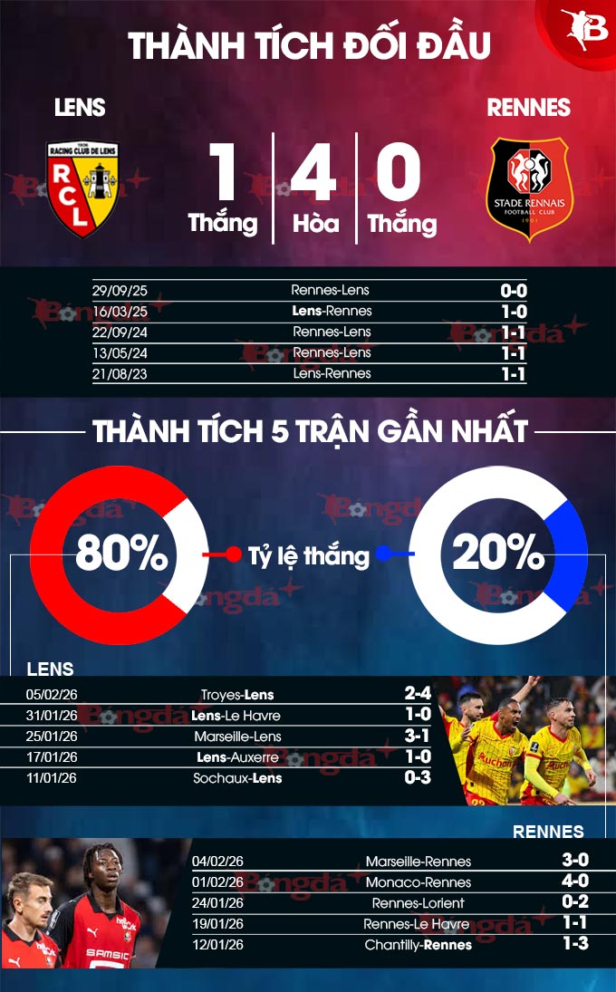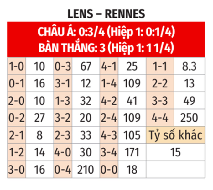 - Tối đa 1 bàn hiệp 1: Cả 8 cuộc chạm trán gần nhất, 5/8 trận gần đây của Lens và 7 trận vừa qua của Rennes đều có không quá 1 bàn thắng trong hiệp 1. Ngoài ra, 5/6 trận sân nhà gần đây của Lens và 7/8 chuyến làm khách vừa qua của Rennes đều có kịch bản tương tự trong hiệp đầu.