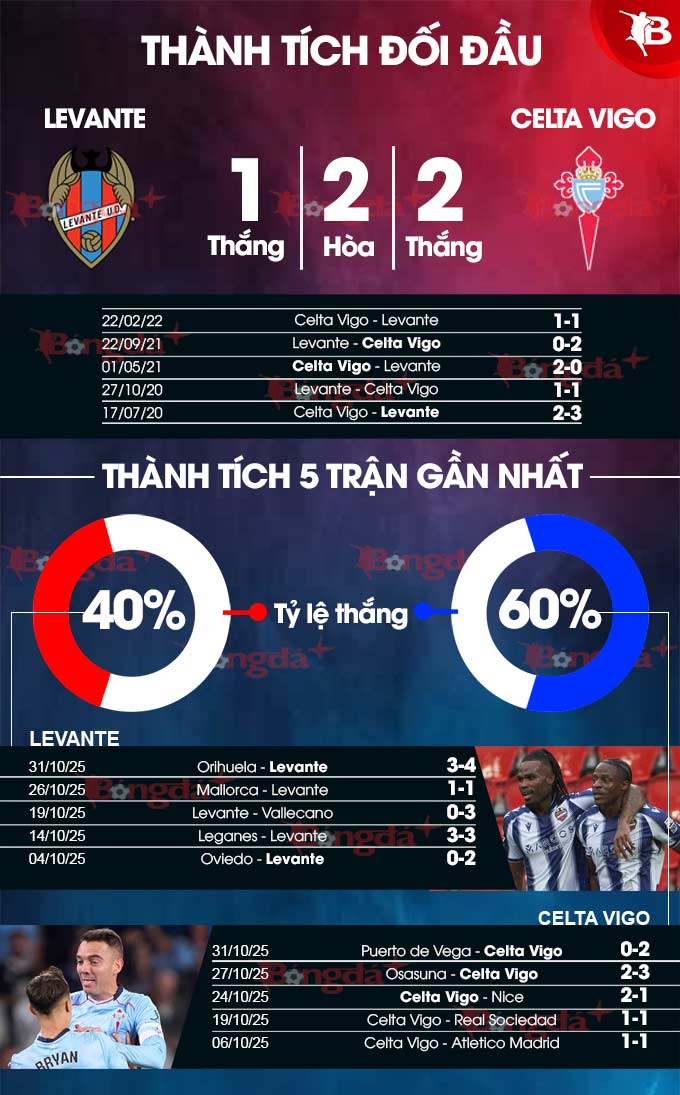 Levante chỉ giành được chiến thắng 6 trong số 30 trận đấu trước đó với Celta Vigo trên mọi đấu trường, lần gần nhất họ giành chiến thắng trước đối thủ này là vào tháng 7/2020.