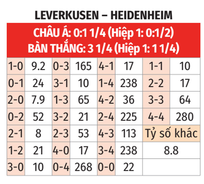 - Tỷ số chẵn: 3/4 trận gần nhất của Heidenheimer kết thúc với tỷ số chẵn. 5/6 trận sân nhà vừa qua của Leverkusen cũng có số bàn thắng chia hết được cho 2.
