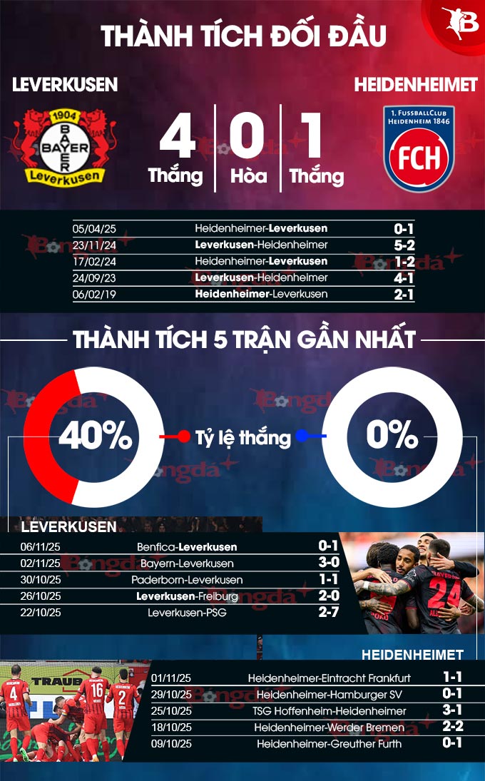 Những dữ liệu trong quá khứ chỉ ra rằng, Heidenheimer rất sợ phải chạm trán Leverkusen. Đội bóng này đã toàn thua trong cả 4 cuộc đụng độ gần nhất giữa 2 bên, nên ngay cả cầm chân Leverkusen với Heidenheimer cũng là vấn đề nan giải.