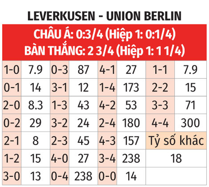 - Chẵn bàn thắng: 6/9 trận đối đầu gần nhất giữa 2 CLB có tổng bàn thắng chia hết cho 2. Ngoài ra, 4/5 trận vừa qua của Leverkusen và 2/3 trận vừa xong của Union Berlin chứng kiến điều tương tự.