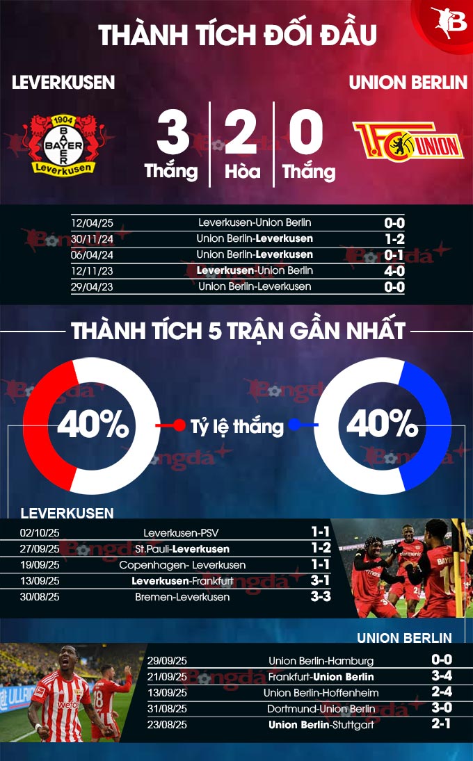 Điểm tựa cho Leverkusen ngoài sân nhà là thành tích đối đầu trực tiếp tốt hơn Union Berlin khi bất bại ở 9 trận gần nhất. Cụ thể hơn, Leverkusen thắng 4 và hòa 5. Quan trọng hơn, 8 lần gần nhất tới làm khách ở BayArena, Union Berlin không thắng, khi thua 4 và hòa 4. Do đó, có khả năng, đội chủ nhà sẽ có 3 điểm ở trận này.