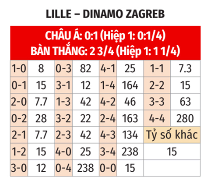 - Hiệp 1 từ 2 bàn trở lên: 3/4 trận sân nhà vừa qua của Lille chứng kiến tối thiểu 2 lần lưới rung trong hiệp 1. Kịch bản tương tự cũng xảy ra ở cả 4 trận gần đây của Dinamo Zagreb và ở cả 2 chuyến xa nhà vừa qua của Dinamo Zagreb. Trận này khó có ngoại lệ.