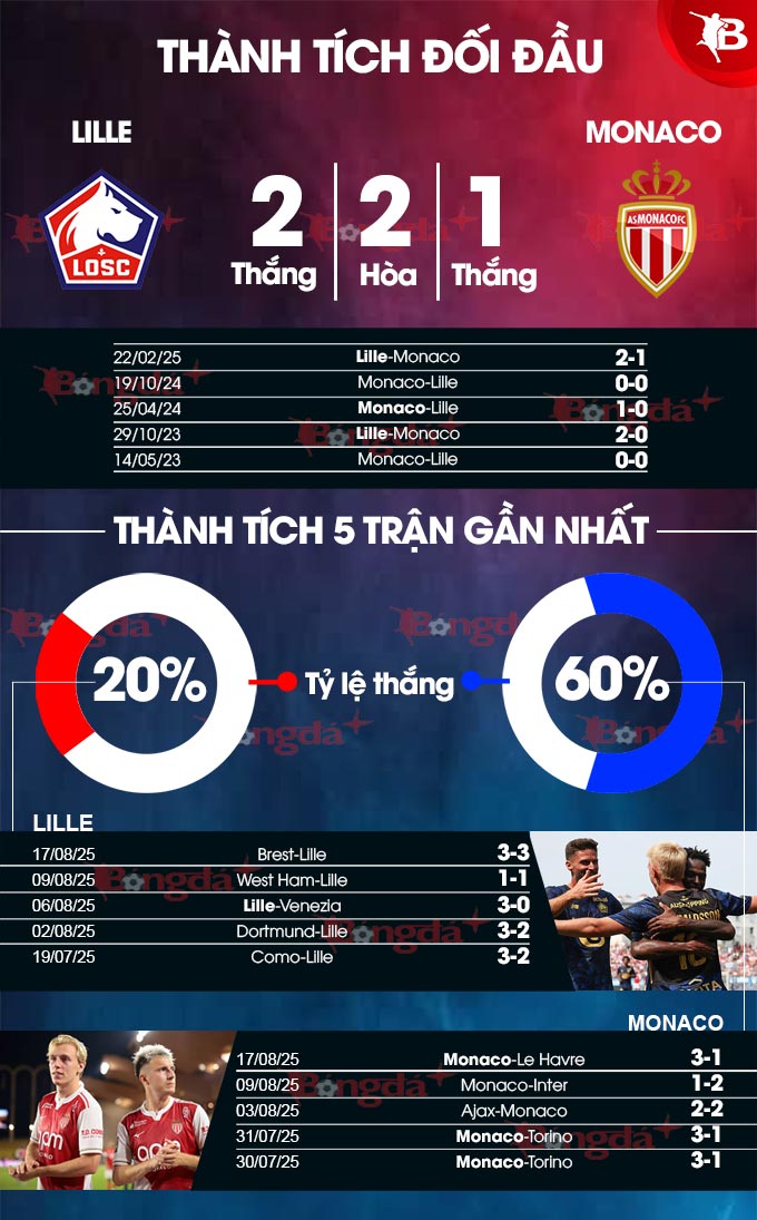 Ở 8 cuộc đối đầu gần nhất giữa hai đội tại sân Pierre-Mauroy, cục diện rất cân bằng với 4 chiến thắng cho chủ nhà Lille và 4 chiến thắng cho đội khách Monaco.