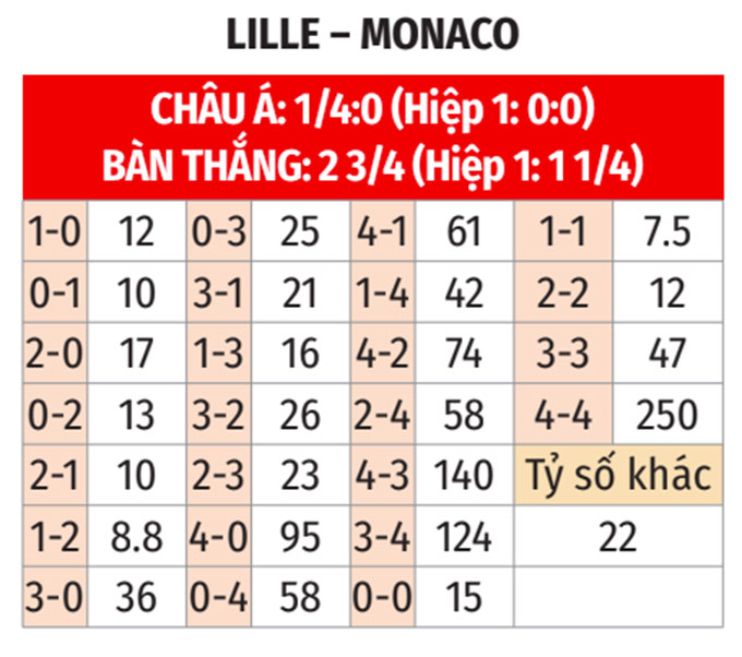 - Lille ghi bàn hiệp 1: Cả 3 cuộc đón tiếp Monaco gần nhất tại Ligue 1, Lille đều ghi được ít nhất 1 bàn thắng trong hiệp 1. Hơn nữa, Lille cũng ghi bàn trong hiệp đấu đầu tiên ở cả 3 trận gần đây và ở 6/9 trận sân nhà vừa qua. Trận này khó có ngoại lệ.