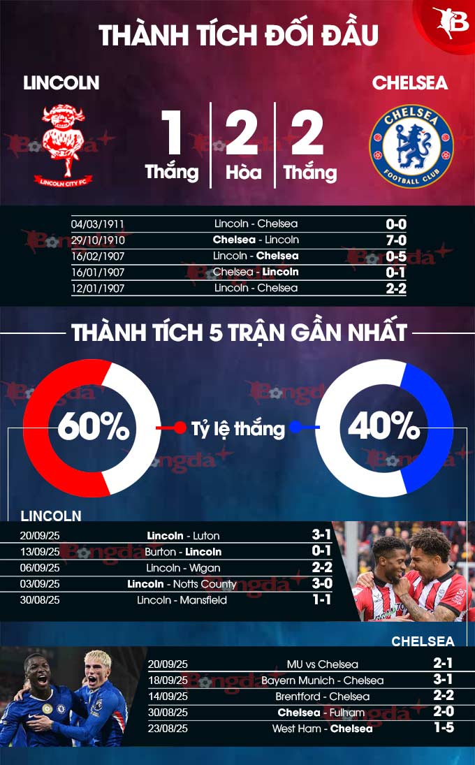 Tuy nhiên, trong số các đối thủ ở chuỗi bật bại của Lincoln, không có đội bóng nào mạnh và đẳng cấp như Chelsea, vị khách mà họ phải đón tiếp ở vòng 3 League Cup lần này. Trong quá khứa rất xa trước kia, hai đội từng chạm trán nhau 7 lần, và Chelsea cũng áp đảo. Cụ thể, The Blues thắng 4, hòa 2 và chỉ thua 1.