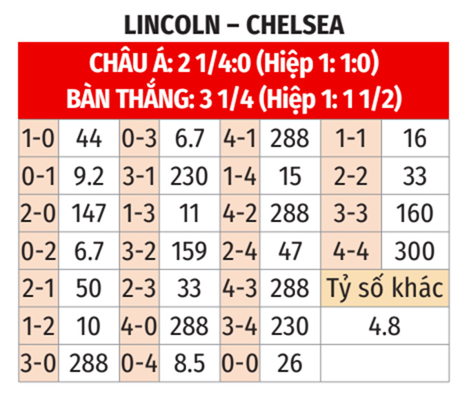 - Lincoln thắng theo châu Á: Lincoln thắng 8/10 trận gần nhất, thắng 5/5 trận sân nhà vừa qua. Còn Chelsea thua cả 3 trận gần đây, thua cả 3 chuyến làm khách gần nhất. Do vậy, giới mộ điệu hãy tin tưởng ở Lincoln trận này.