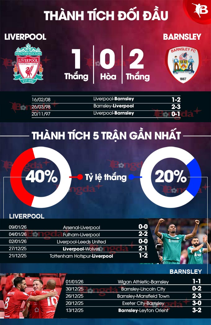 Trước màn so T được dự đoán là không cân sức với Liverpool, Barnsley không có sự chuẩn bị tốt về tâm lý do họ đang có chuỗi 4 trận không thắng liên tiếp (thua 3). Ngoài ra, thành tích sân khách của Barnsley cũng rất tệ, bởi đội bóng này chỉ biết đến hòa và thua ở 10/12 chuyến hành quân xa nhà gần đây. Chỉ phải so T với đối thủ tầm thường như Barnsley, câu hỏi đặt ra với Liverpool chỉ là họ sẽ thắng với cách biệt bao nhiêu bàn, chứ tấm vé đi tiếp coi như đã nằm chắc trong tay thầy trò HLV Slot.
