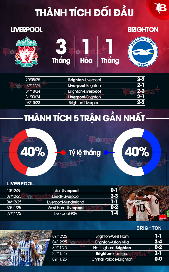 Và đụng độ Brighton ở thời điểm hiện tại là một thử thách thực sự cho Arne Slot và các học trò. Chim mòng biển nằm trong số nhiều đội bóng đang bám sát các vị trí dự cúp châu Âu. Tuy nhiên, họ cũng chỉ hơn vị trí thứ 12 đúng 1 điểm sau khi không thắng trong hai trận gần nhất. Ngoài ra, Brighton chỉ thắng một trong tám chuyến làm khách đến Anfield tại Ngoại hạng Anh (2 hòa, 5 thua) nhưng đã ghi ít nhất một bàn thắng trong mỗi sáu lần làm khách gần nhất. Điều đó đủ giúp họ tự tin để giành được một kết quả tốt trước ĐKVĐ Premier League.