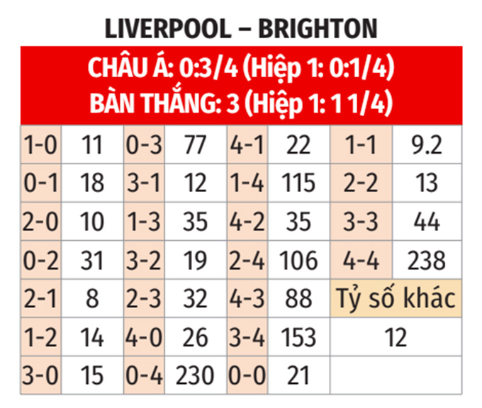 - Hiệp 1 tối đa 1 bàn: 5/6 trận gần đây của Liverpool và 6/7 trận vừa qua của Brighton đều có không quá 1 bàn trong hiệp đấu đầu tiên. Ngoài ra, kịch bản tương tự trong hiệp 1 cũng xảy ra ở 6/8 trận sân nhà gần đây của Liverpool và ở 5/6 chuyến làm khách vừa qua của Brighton.