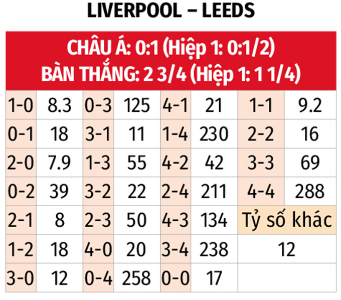 - Từ 3 bàn thắng trở lên: 3/4 trận gần đây của Liverpool tại Ngoại hạng Anh đều có từ 3 bàn thắng trở lên. Với Leeds, 7/9 trận vừa qua của đội khách cũng xuất hiện ít nhất 3 tình huống làm bàn. Kịch bản tương tự cũng diễn ra ở 6/7 trận đối đầu gần nhất.