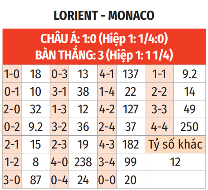 Lorient có lợi thế sân nhà nhưng thắng 1 và thua 1 ở Ligue 1 2025/26. Chiều ngược lại, Monaco thắng 2/5 trận chính thức ở sân khách vừa qua. Bên cạnh đó, kinh nghiệm, đẳng cấp và đối đầu trực tiếp của Lorient kém xa Monaco. Có khả năng, đội khách sẽ có 3 điểm.