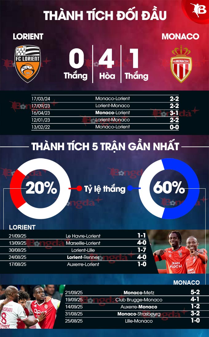 Đang ở giai đoạn khó khăn, Lorient phải gặp Monaco. Lúc này, phong độ của Lorient vs Monaco đang rất chênh lệch. Trong khi Lorient chỉ thắng 1/5 trận gần nhất còn Monaco thắng 4/6 trận gần đây.