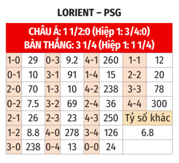 - PSG ghi bàn hiệp 1: PSG ghi được ít nhất 1 bàn trong hiệp 1 ở 5/7 cuộc đối đầu gần nhất, ở 3/4 chuyến làm khách vừa qua tại sân Le Moustoir của Lorient. Ngoài ra, PSG cũng xuyên thủng lưới đối phương tối thiểu 1 lần trong hiệp đầu ở 5/6 trận gần nhất, ở 6/8 chuyến làm khách vừa qua.