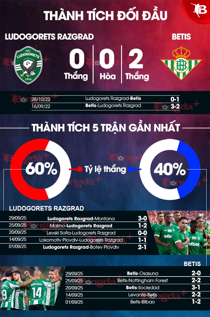 - Hai đội cùng ghi bàn: 5/7 trận gần nhất của Ludogorets Razgrad và 8/10 trận gần đây của Betis đều khép lại với ít nhất 1 bàn thắng cho mỗi đội. Ngoài ra, 17/19 trận làm khách vừa qua của Betis cũng khép lại mà không đội nào giữ sạch lưới nhà.