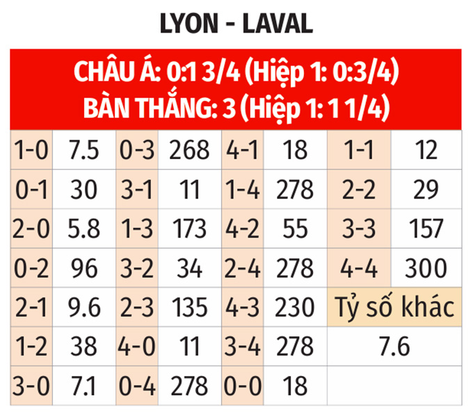 • Lyon thắng theo châu Á: Lyon thắng cả 8 trận gần nhất, thắng cả 5 trận sân nhà vừa qua. Còn Laval thua 5, hòa 1, thắng 1 ở 7 trận gần đây. Do vậy, giới mộ điệu có thể đặt niềm tin vào Lyon ở trận này.