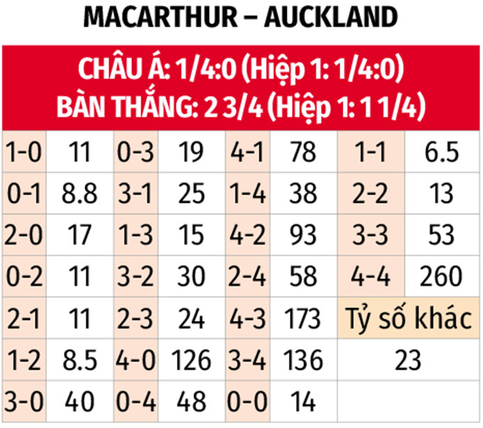 - Macarthur thắng châu Á hiệp 1: Đội chủ nhà thắng theo châu Á 4 và hòa 2 ở 6 trận đấu gần đây trong hiệp 1. Với Auckland, đội khách thua châu Á 2 và hòa 1 trong 3 trận vừa qua trước giờ nghỉ.