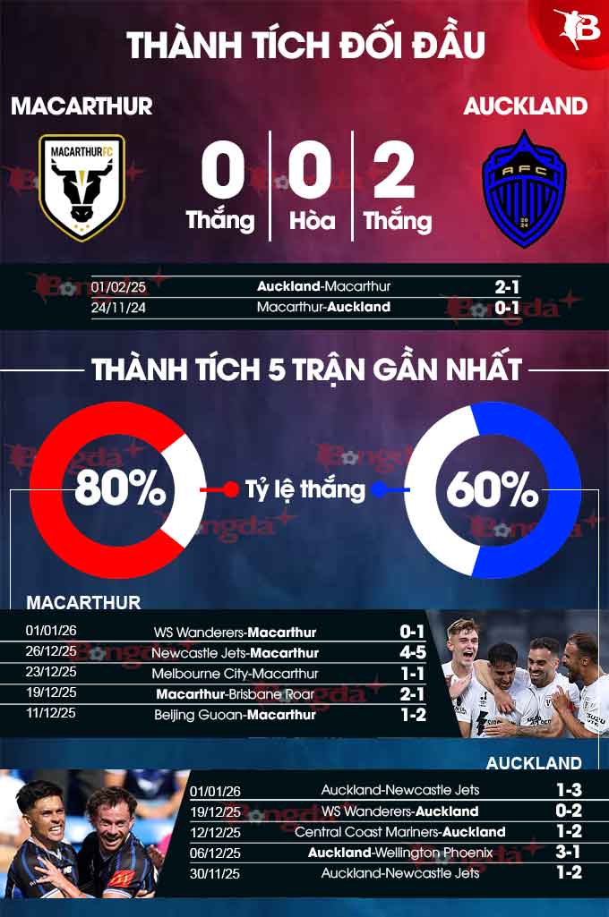 Nếu tính riêng tại sân chơi A-League, Macarthur đang toàn thắng 2 trận liên tiếp gần đây, đồng thời bất bại 4 trận (3 thắng, 1 hòa) kể từ sau thất bại trước Perth Glory trên sân nhà cuối tháng 11/2025. Chính chuỗi trận ấn tượng này giúp Macarthur vươn lên thứ 4 trên BXH với 18 điểm, kém đối thủ Auckland ở ngôi đầu bảng 2 điểm nhưng đá nhiều hơn 1 trận.