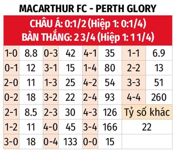 - Từ 3 bàn thắng trở lên: 3/4 trận sân nhà gần đây của Macarthur cùng 5/6 trận vừa qua của Perth Glory đều có từ 3 bàn thắng trở lên. Kịch bản tương tự cũng diễn ra ở 7/9 trận đối đầu gần nhất giữa đôi bên.