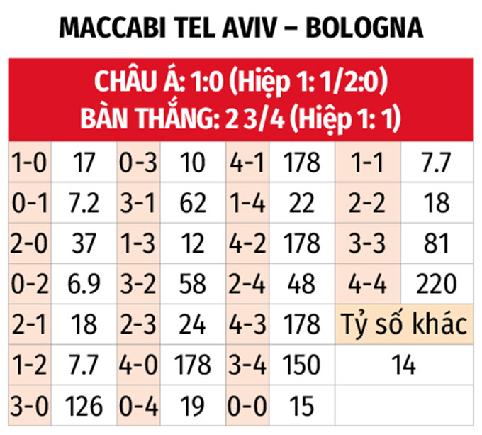 - Lẻ bàn thắng: 4/5 trận gần đây của Maccabi Tel Aviv kết thúc với tổng bàn thắng là lẻ. Kịch bản lẻ bàn thắng cũng diễn ra ở 3/4 trận vừa qua của Bologna.