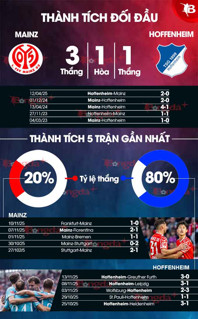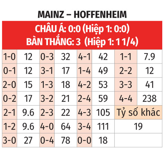 Cụ thể, trong khi Mainz chỉ thắng 1/5 trận gần nhất thì Hoffenheim thắng 4/5 trận vừa xong. Mainz có lợi thế sân nhà ở trận này nhưng họ đang gặp vấn đề về phong độ và tâm lý.