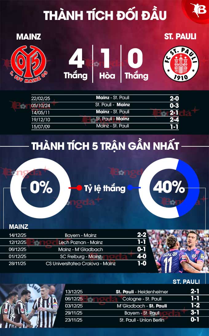 - Lưới rung cuối trận: 3/4 trận sân nhà gần đây của Mainz đều có bàn thắng được ghi sau phút 75. 3/4 trận vừa qua của St. Pauli bảng tỷ số vẫn cập nhật trong 7 phút cuối.