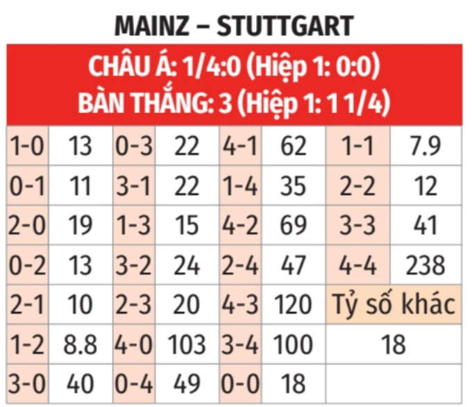 - Tối đa 1 bàn hiệp 1: 4/5 lần gặp giữa 2 đội gần đây trên sân của Mainz chỉ xuất hiện nhiều nhất 1 bàn thắng trong hiệp 1. Tình trạng tương tự xảy ra ở 9/11 trận gần đây của Mainz và 6/8 trận vừa qua của Stuttgart tại giải nội địa.