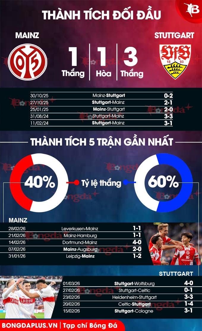 Stuttgart cũng có sự ủng hộ của lịch sử. Theo quan sát, trong 6 lần chạm trán giữa 2 đội gần đây, họ thắng 4, hòa 1, chỉ để thua Mainz 1 trận. Tương tự, trong 6 chuyến làm khách trên sân của Mainz vừa qua, họ cũng thắng 4, hòa 1 và thua 1 trận.